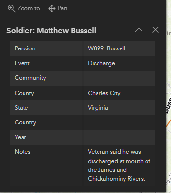 According to this map, using the legend, it shows that he lived in the Lonesome Valley Area of Claiborne County, TN in 1831. He was married in Spotsylvania County, VA (near Richmond, VA) in 1791. The map shows he was discharged in Charles City, VA (when you click on the dot, it gives details) here are the details of Matthew’s discharge information: