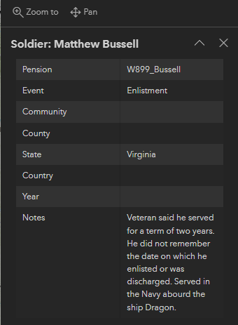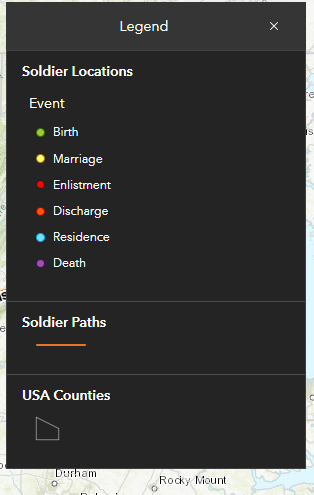 You can see the list of names on the left and when you click on a name, it will show you on a map everything they know about the person. Each dot on the map has a different color for birth, enlisting, etc. Here is the legend: