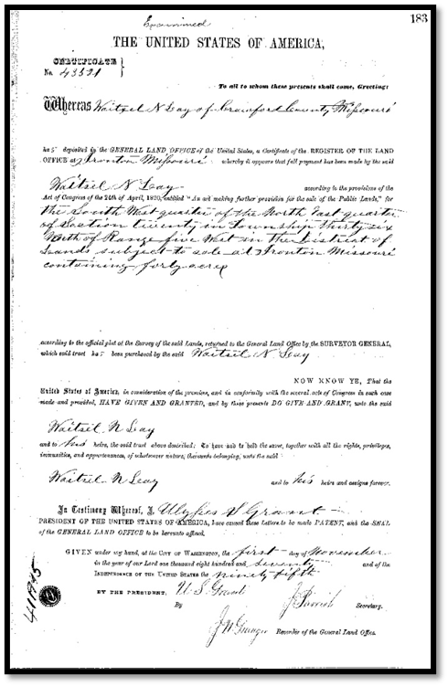 Lewis’s daughter, Mildred married Waitsel Nuley Lay, the son of James Newton Lay and Mary Bryant, on 09 Apr 1850 in Tazewell, Claiborne County, Tennessee. He served with the Dent County, Missouri State Militia during the civil war. Mildred filed for a widow’s pension 18 Sep 18(91?) date unreadable, application #463393. On April 24, 1820, land was granted to Waitsel N. Lay, 40 acres in Crawford County, Missouri. The grant was signed by Ulysses S. Grant, our 18th United States President.