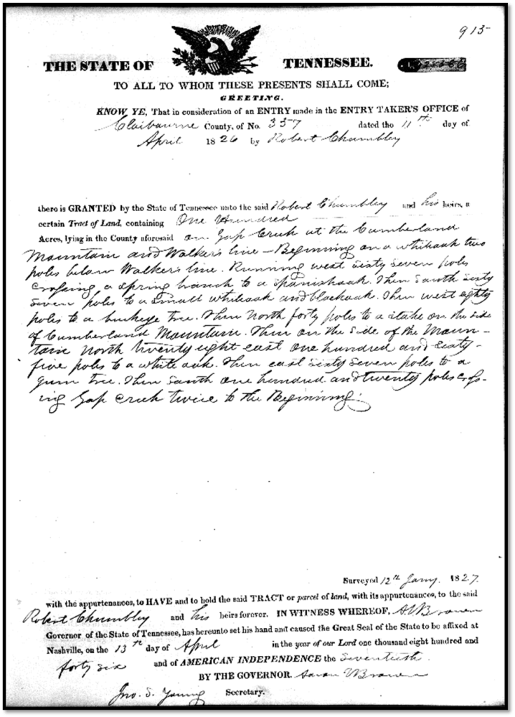 On 11 April 1826 in Claiborne County, Tennessee; Robert purchased 100 acres of land between Cumberland Mountain, Gap Creek, and Walker’s Line in Claiborne County, Tennessee. Currently the area is known as Tiprell, Tennessee. Isaac Ely and Andrew Chumley, sworn chainers. A copy of the deed was found in an old record book about surveys on top of shelves in vault where records of deeds are kept in Claiborne County, Tennessee Court House, Tazewell, Tennessee. On page 94, entry #357, dated April 11, 1826.