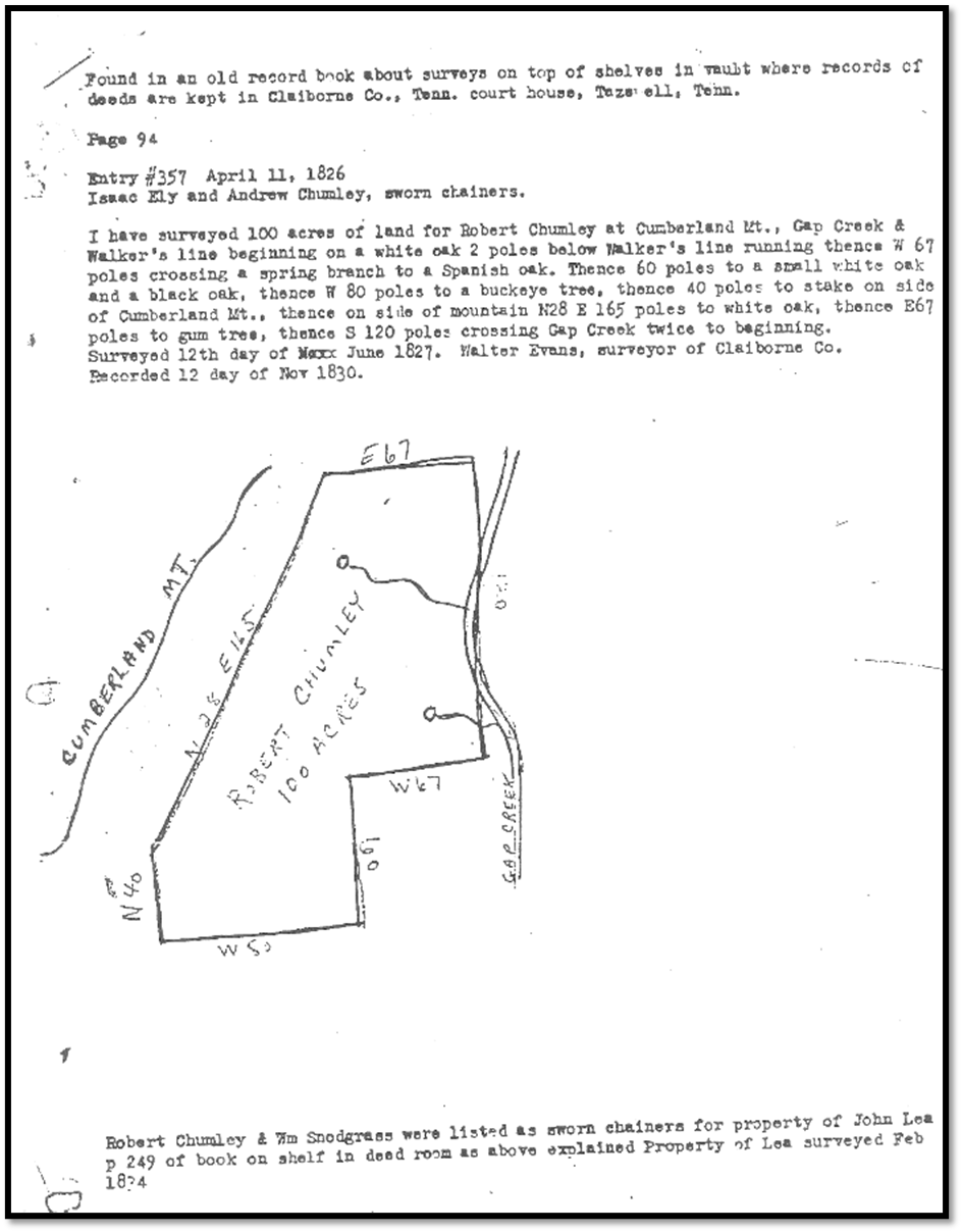 On 11 April 1826 in Claiborne County, Tennessee; Robert purchased 100 acres of land between Cumberland Mountain, Gap Creek, and Walker’s Line in Claiborne County, Tennessee. Currently the area is known as Tiprell, Tennessee. Isaac Ely and Andrew Chumley, sworn chainers. A copy of the deed was found in an old record book about surveys on top of shelves in vault where records of deeds are kept in Claiborne County, Tennessee Court House, Tazewell, Tennessee. On page 94, entry #357, dated April 11, 1826.