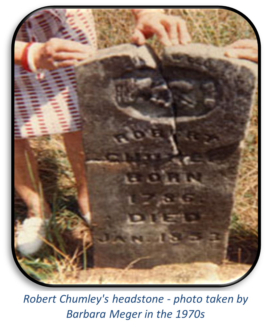 ROBERT CHUMLEY was born in 1786 in Virginia. He died on 18 Jan 1853 in Bolivar, Polk County, Missouri. He married Elizabeth “Betsy” about 1800 in Virginia. She was born in 1775 in Virginia (Both the 1830 census and 1840 census report list her age range as being born between 1781 and 1790.). She died about 1845 in either Tennessee, Arkansas, or Missouri. They were married sometime around 1800.